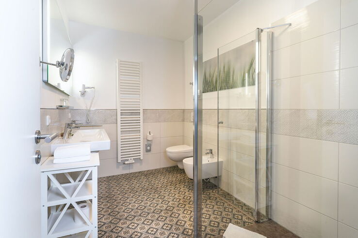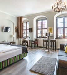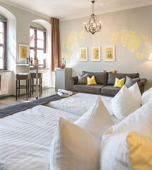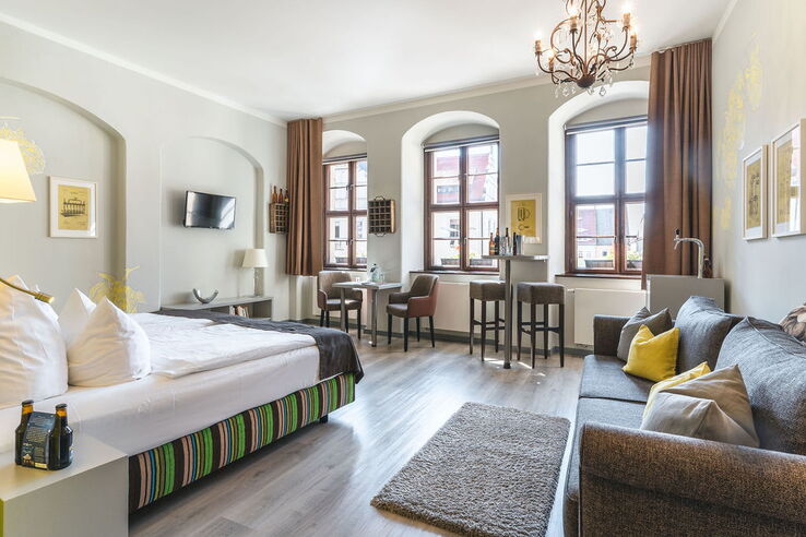 Außergewöhnlich und mit viel Liebe zum Detail erwartet Sie ein großräumiges, hell und modern eingerichtetes Zimmer. Das Braumeister-Zimmer hat eine Größe von 30 qm und begeistert mit einem wunderschönen Blick auf den mittelalterlichen Markplatz von Pirna. Eine gemütliche Couch mit Sitzecke lädt zum Verweilen ein und das große Doppelbett der Firma Schramm Werkstätten bringt Ihnen erholsamen Schlaf. Ein großzügiges stilvoll eingerichtetes Bad mit ebenerdiger Dusche und Kosmetikspiegel bietet Ihnen jeglichen Komfort. Unser Braumeister-Zimmer ist ein Nichtraucher-Zimmer.